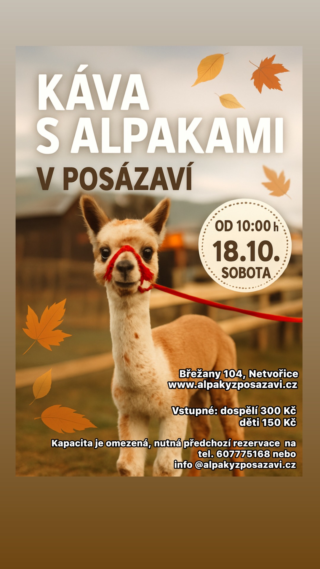 Připravili jsme pro vás vánoční poukazy na návštěvu naší farmy. Na výběr máte ze tří druhů zážitků. Více informací najdete na našich webových stránkách www.alpakyzposazavi.cz .Každý si přijde na své – ať už chcete prožít návštěvu aktivně na alpaka trekkingu, nebo si užít pohodovou atmosféru u nás na farmičce, obklopeni alpakami. Můžete také vyrazit...